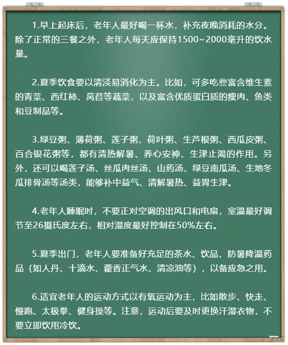 此外,如果家中有患高血压、冠心病、糖尿病等基础疾病及生活不能自理的老年人,那么一定要注意房屋通风及做好防暑降温工作。一旦家中的老年人出现中暑症状,要及时就医,以免耽误最佳抢救治疗时机。