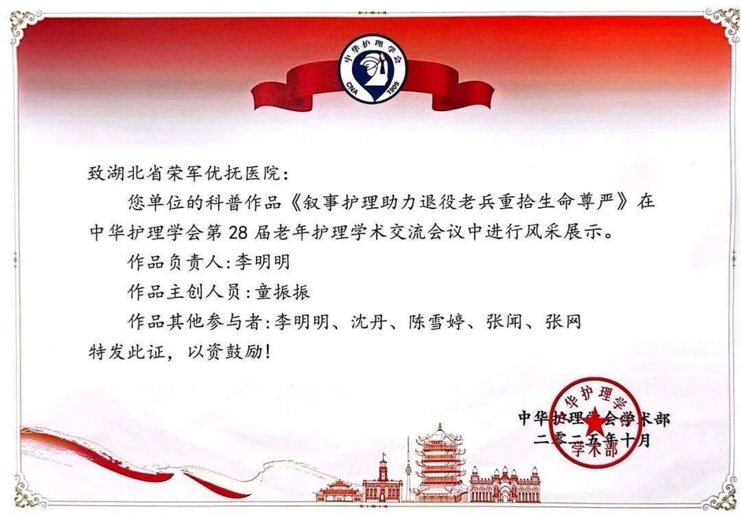 湖北省荣军优抚医院老年医学科护理团队受邀参会并进行风采展示,凭借专业实力与创新实践赢得全场关注,其作品《叙事护理助力退役老兵重拾生命尊严》,将叙事护理与荣军优抚特色服务深度融合,展现了老年护理的专业温度,彰显了服务老兵的责任担当,获得与会专家的一致好评。